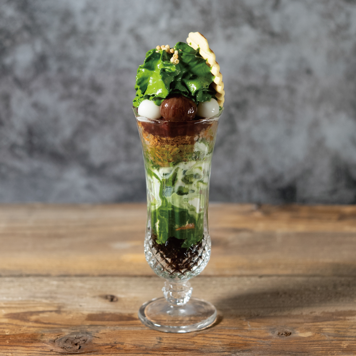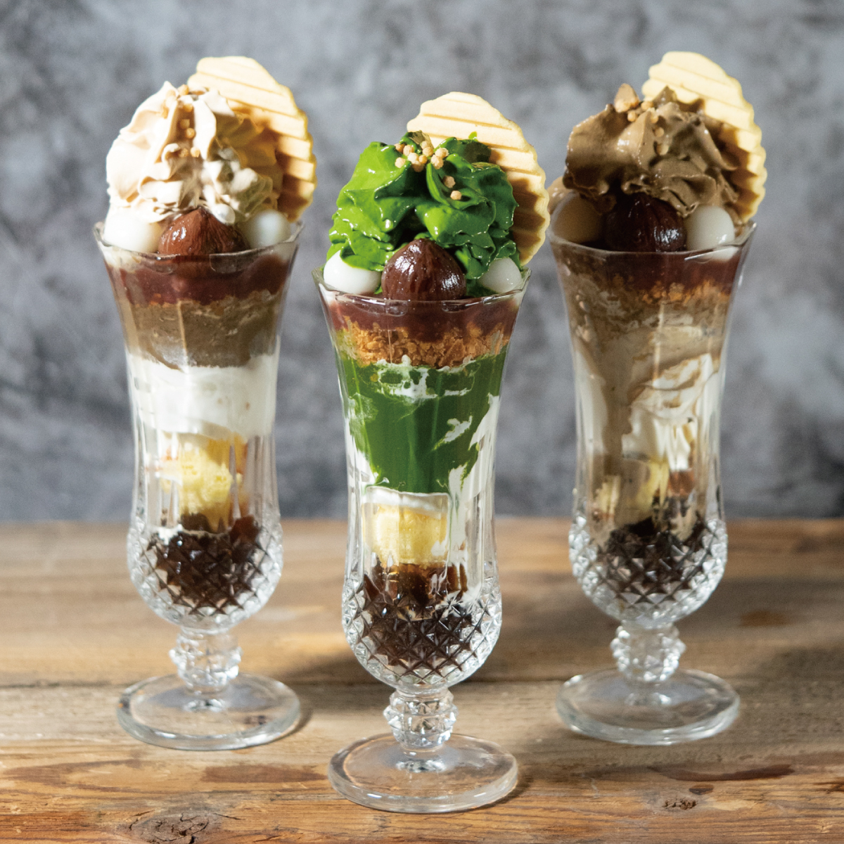 当店ならではの濃厚エスプーマを使ったパフェは、かき氷と同様3種(抹茶・ほうじ茶・みたらし)の特製パフェをご用意しております。和栗がのった清水抹茶パフェ(写真の商品)の他、お手頃サイズのパフェと組み合わせの異なる2サイズのパフェをご提供しておりますので、お好みのパフェをご賞味ください。