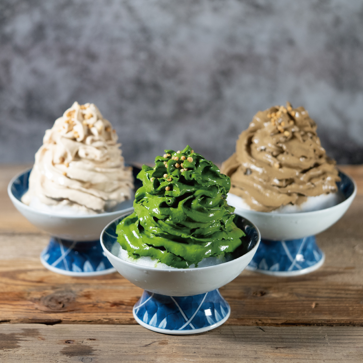 抹茶エスプーマ発祥の店が提供する大人気の「抹茶雪氷」をはじめとするかき氷は、他店とは異なる粉雪のようなフワフワで口溶けの良い特注のかき氷機で仕上げた、ここでしか味わえない特別なかき氷。味わい深い宇治抹茶のエスプーマの他にも、ほうじ茶、みたらし(ほうじ茶)の3種のフレーバーで味わえます。